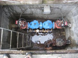 Before we can do a backflow assembly test on this DCDA backflow prevention assembly for the fire service of a rather large building we have to locate the fire alarm control panel first. No one at this facility knows what it is, or where to find it.