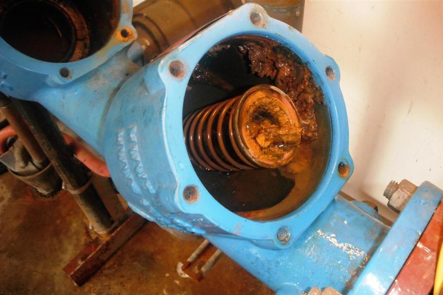 This Wilkins 975 RPBA failed the annual backflow assembly test over a year ago. The backflow tester shut off the valves and the assembly was left to rust. The scale build up you see here is common in systems with high water demand. At some point someone had stripped out the relief valve clover bolts too, in an attempt to fix something that was not broke.