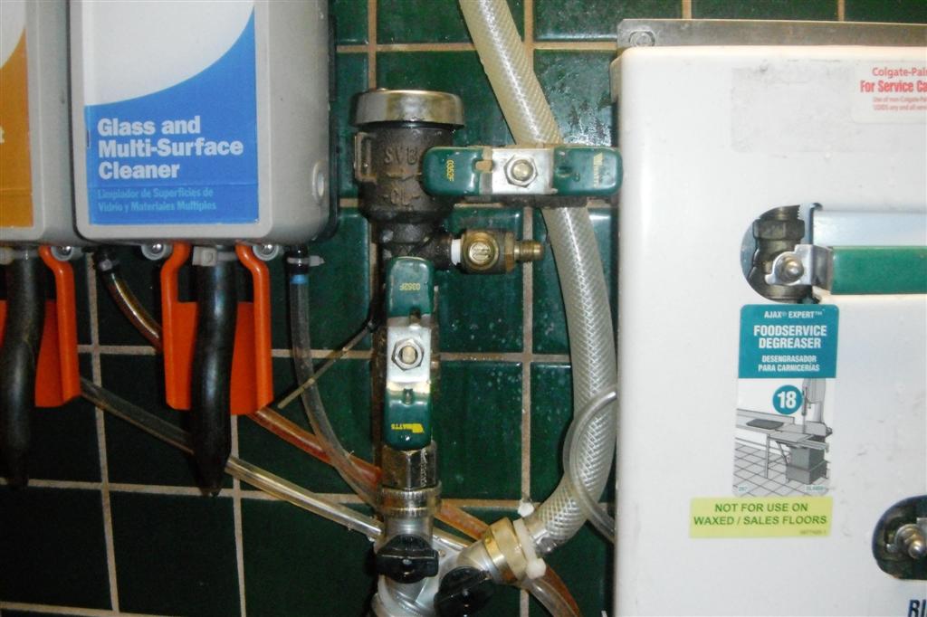 This is a .5” Watts 008PCQT SVBA backflow assembly isolating a soap dispenser in a commercial butcher shop.
