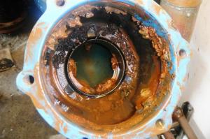 This Wilkins 975 RPBA failed the annual backflow assembly test over a year ago. The backflow tester shut off the valves and the assembly was left to rust. The scale build up you see here is common in systems with high water demand. At some point someone had stripped out the relief valve clover bolts too, in an attempt to fix something that was not broke.